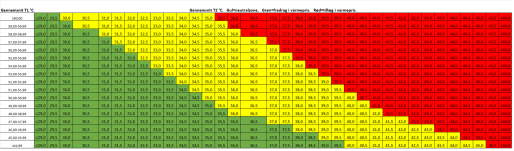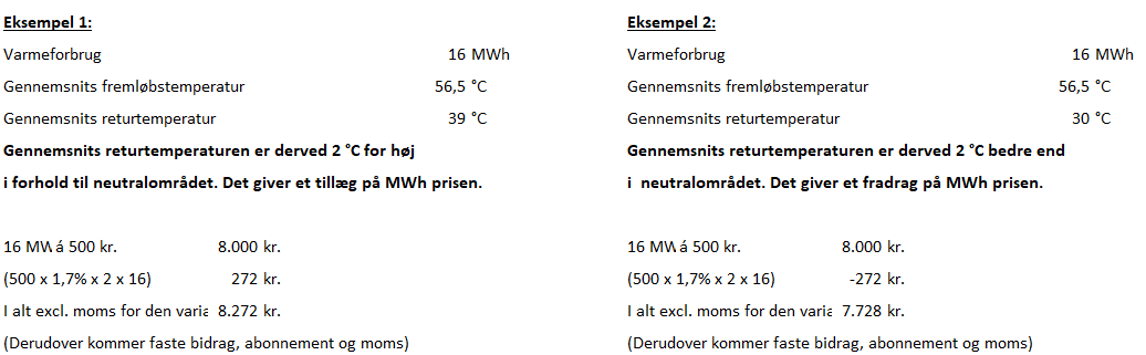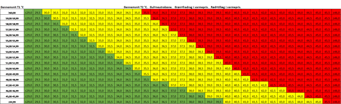 Hvis en forbruger ikke opnår en års gennemsnits afkøling på 30 °C eller mere, pålignes et tillæg på 1,7% på MWh-prisen, pr. grad under 30 °C.